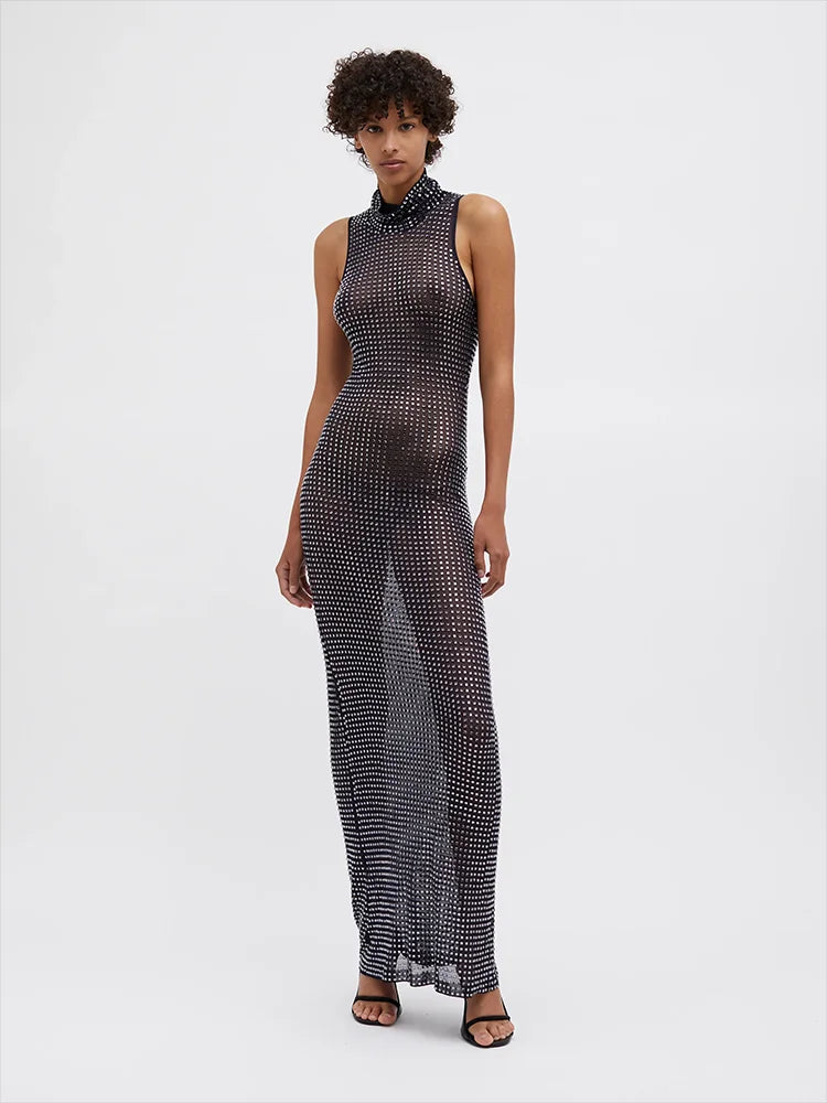 Hot Costume Diamond Perspective Mesh Pile Neck Dress Dress