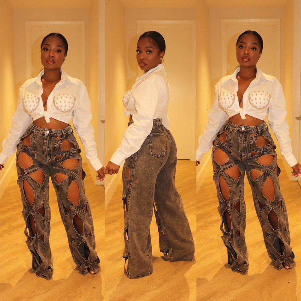 Hot pressed diamond lapel long sleeved street fashion shirt for women