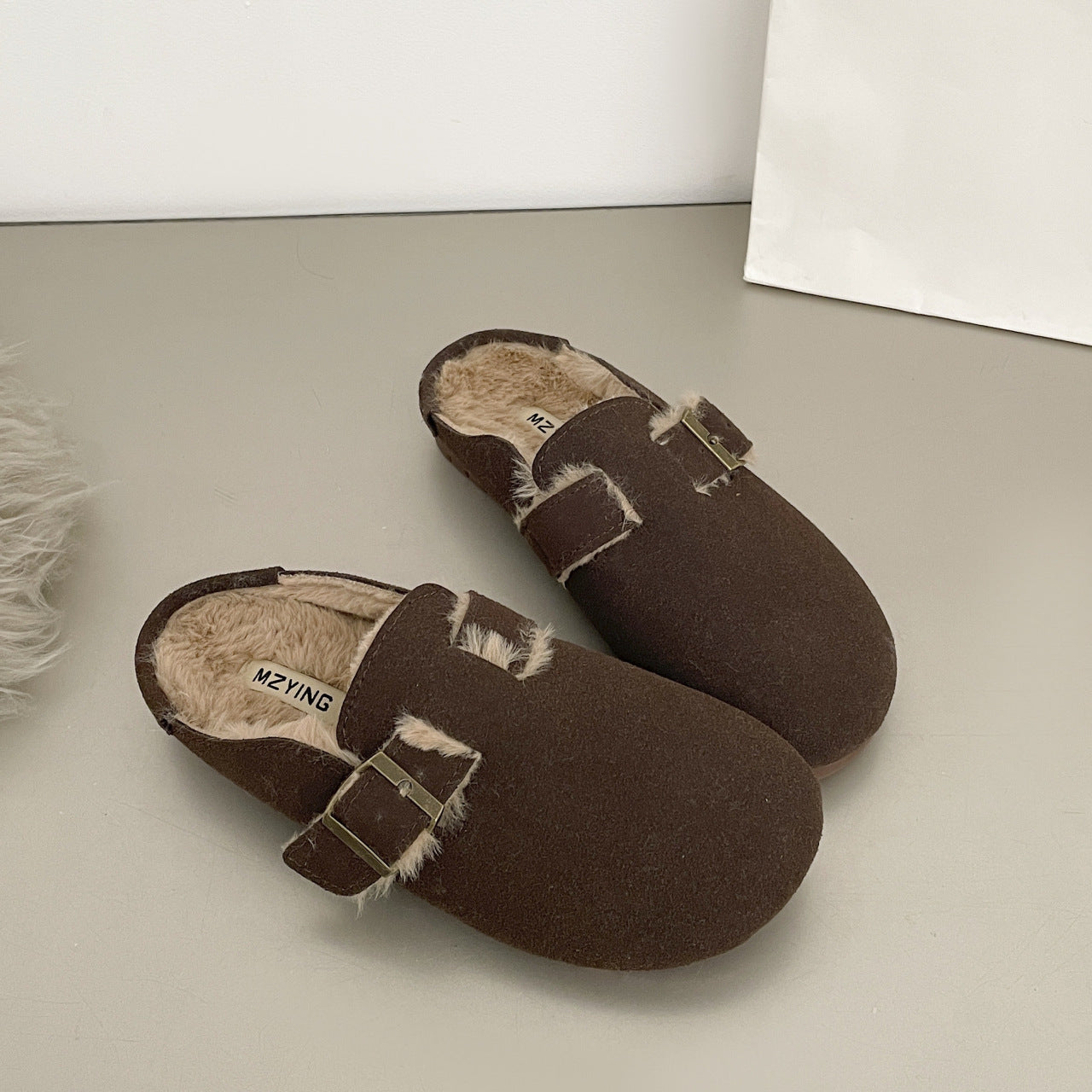 In stock closed toe ladies plush indoor slippers fur lovers flat mules furry cork house slippers for women