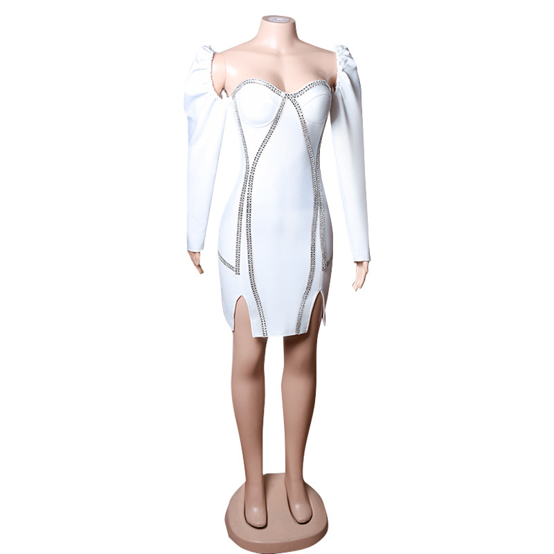 Spring Long Sleeve White Wrap Chest And Diamond Encrusted Dress